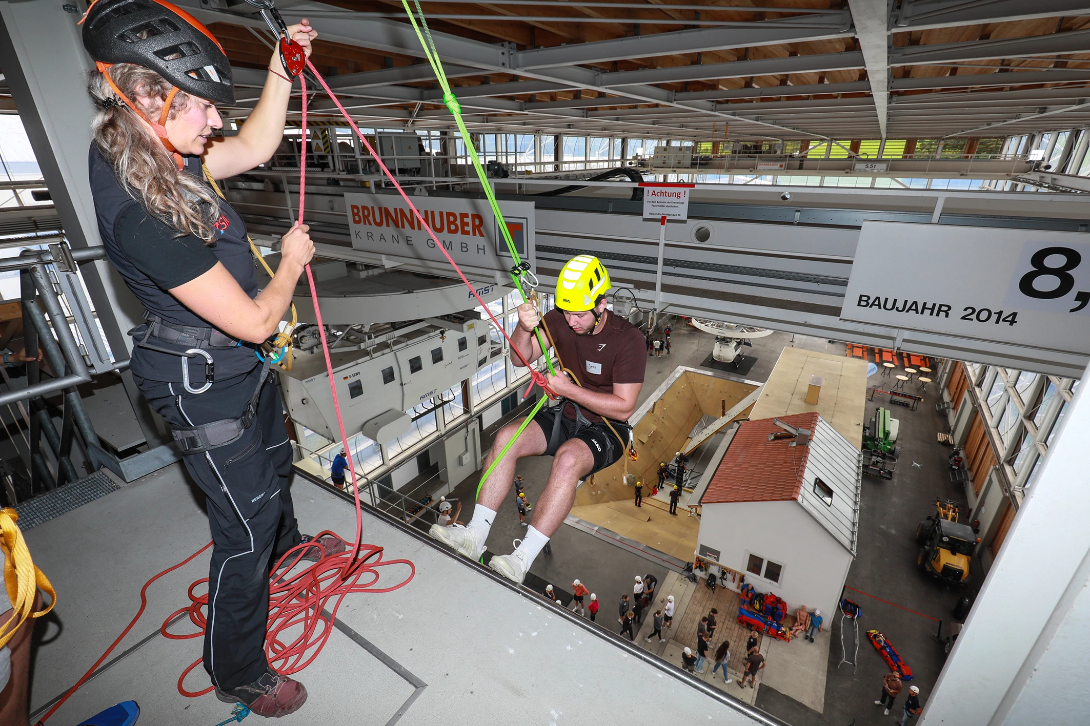 Das muss man sich erstmal trauen: Kevin Keler schaut knapp 20 Meter in die Tiefe. Er überprüft den Halt seines Brustgurts und den Sitz des Sicherungsseils. Dann schiebt er sich langsam über den Abgrund und sagt mit gepresster Stimme: „Alles gut, es kann losgehen!“ Kristina Kramm, Mitarbeiterin im Bergwacht-Zentrum für Sicherheit und Ausbildung (BW-ZSA) in Bad Tölz, gibt Seil und der 17-Jährige schwebt langsam an der senkrechten Kletterwand in die Tiefe.