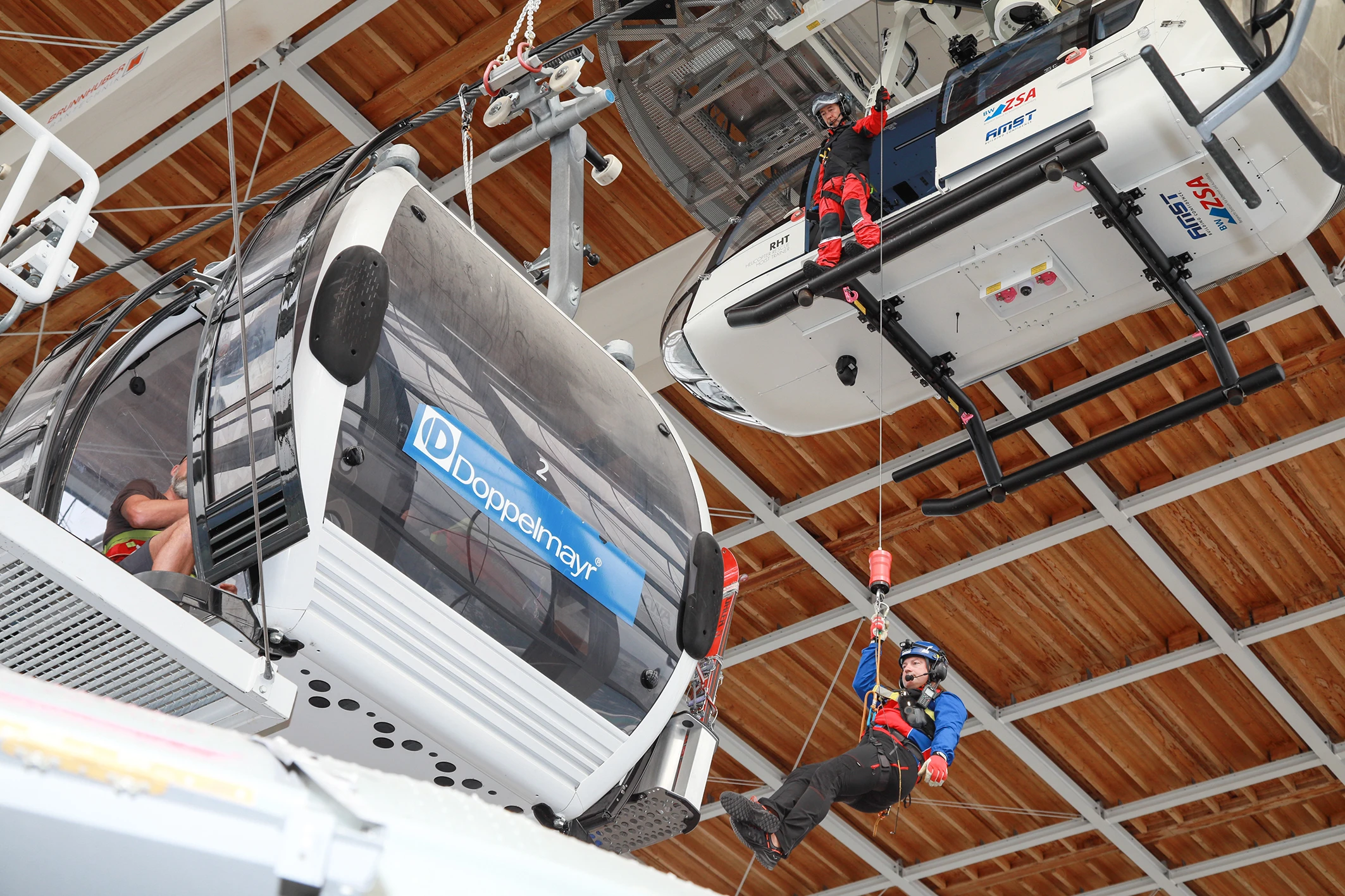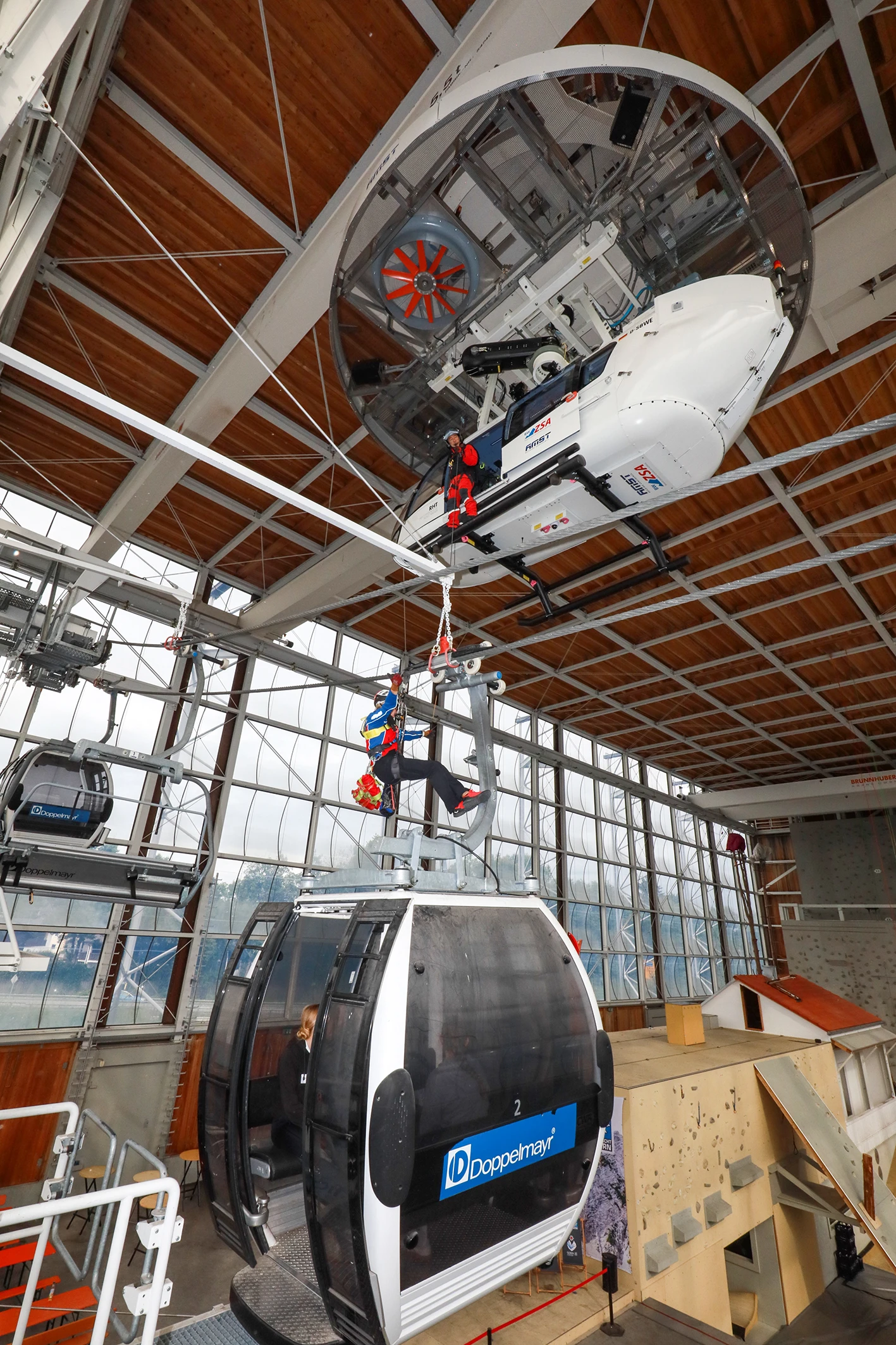 Beim Betreten der 20 Meter hohen und 12.000 Quadratmeter großen Hightech-Halle staunen die Auszubildenden nicht schlecht. Mithilfe von zwei nachgebauten, beweglichen Rettungshelikoptern an einem schweren Kranaufzug lässt sich die Bergung von Verunglückten aus einer Seilbahngondel oder aus dem Sessellift per Rettungsseilwinde simulieren.
