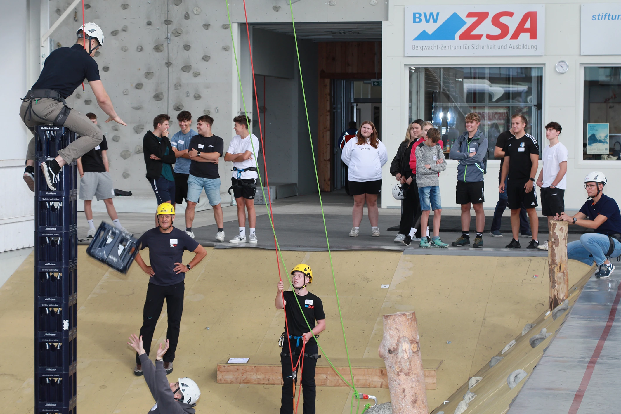 Auch an den anderen Stationen herrscht emsiges Treiben. Begleitet von Mitarbeitern des Bergwacht-Zentrums üben die Azubi-Gruppen und Ausbilder am Klettersteig oder beim Abseilen aus luftiger Höhe. Mut, Balance und Fingerspitzengefühl braucht man beim wackeligen Getränkekistenstapeln am Sicherungsseil. In der Kältekammer geht es bei minus zehn Grad um Wärmeschutz und das Verhalten bei Notfällen. Neben Vorträgen über Bergwachteinsätze übt eine andere Gruppe auch die Bergung von Verletzten mit Rettungssack und mobiler Trage.
