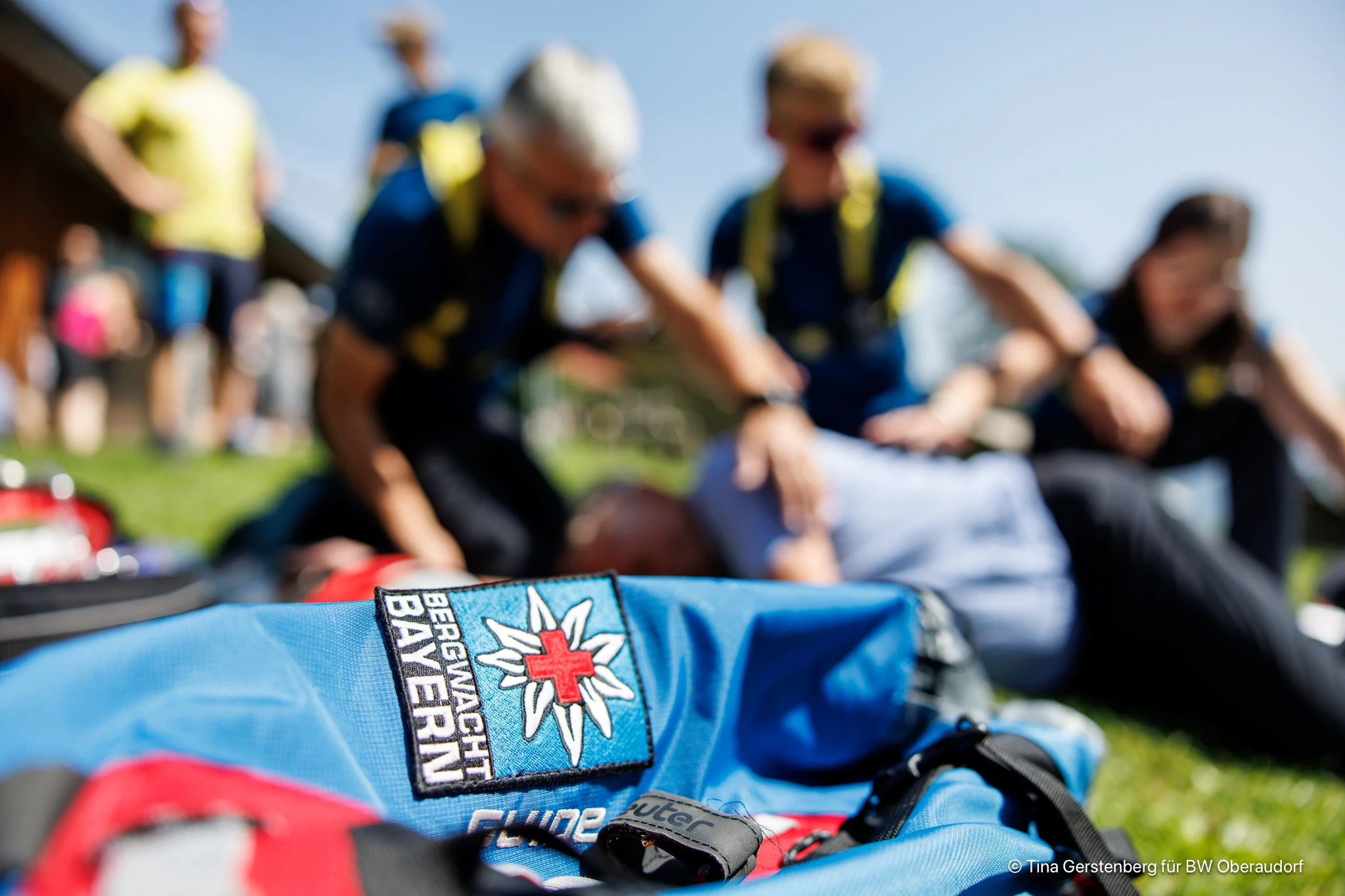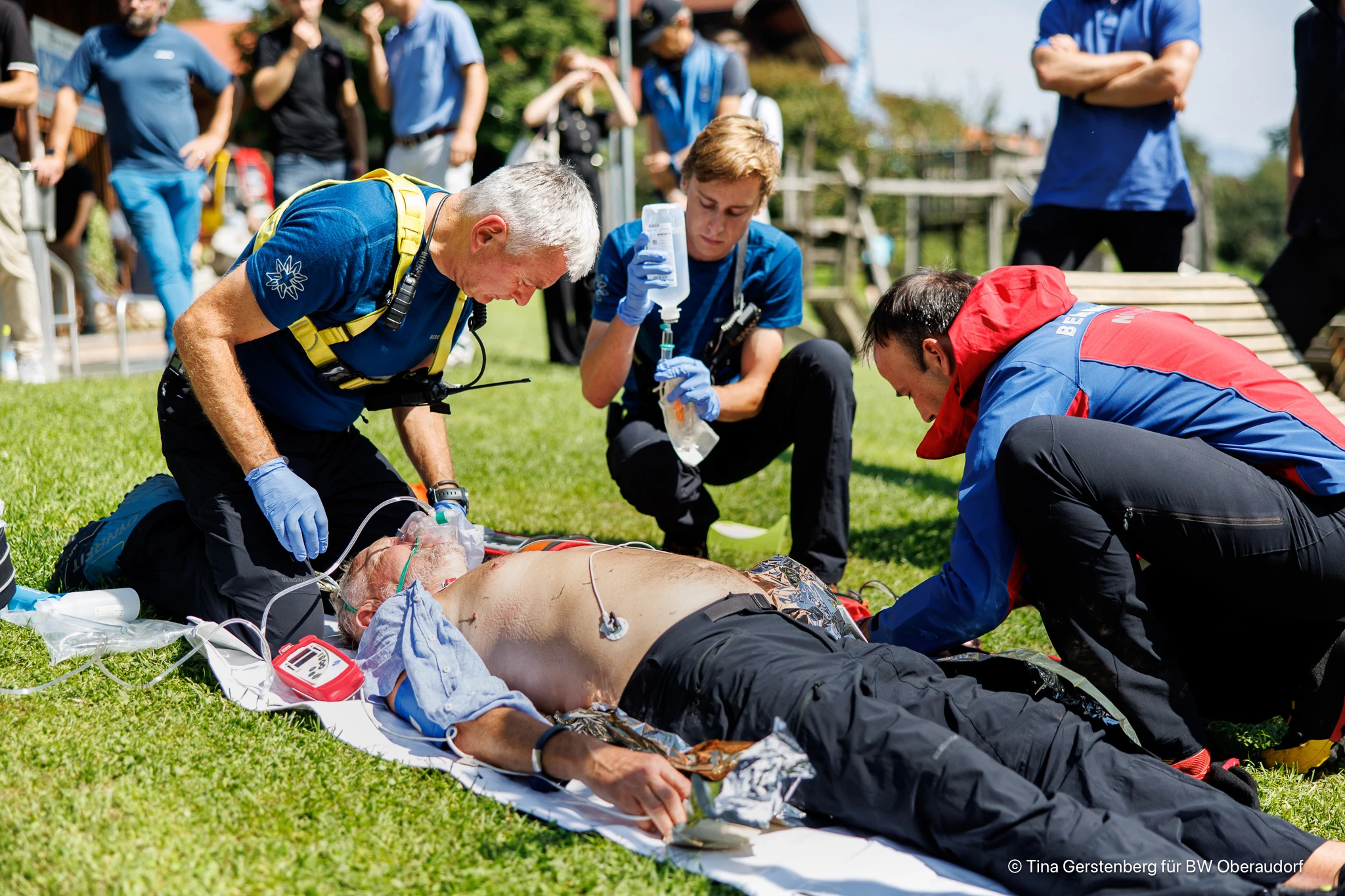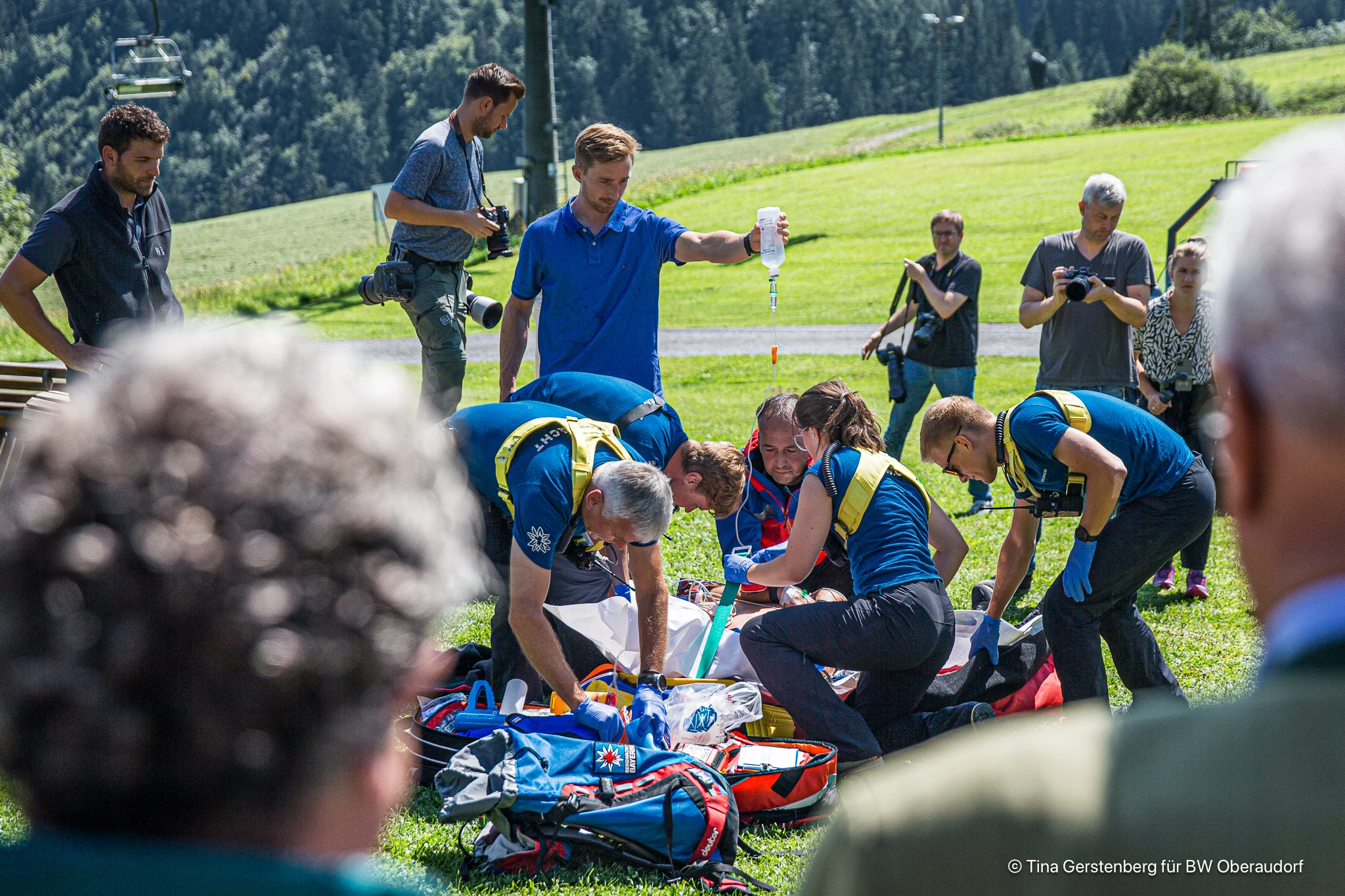 Nachdem der mit interessanten Vorträgen gespickte theoretische Teil der Veranstaltung im Berggasthof Hocheck beendet war, begaben sich die Teilnehmer ins Freie. Bei strahlendem Sonnenschein und einem grandiosen Ausblick über das bayerische Inntal konnte die Bergwacht ihre Möglichkeiten demonstrieren. In einem medizinischen Fallbeispiel hatte ein Wanderer mit akuten Herz-Kreislaufbeschwerden das Bewusstsein verloren und war von anwesenden Ersthelfern erfolgreich reanimiert worden. Einsatzkräfte der Bergwacht Bayern, Bereitschaft Oberaudorf-Kiefersfelden, führten den Teilnehmern anschließend vor, wie Versorgung und Abtransport eines Patienten in der Regel ablaufen. Das strukturierte Vorgehen wurde dabei von Ausbildungsleiter Peter Albrecht für die staunenden Anwesenden kommentiert. Nach wenigen Minuten befand sich der „Patient“ im Einsatzfahrzeug und auf dem Weg ins Krankenhaus.