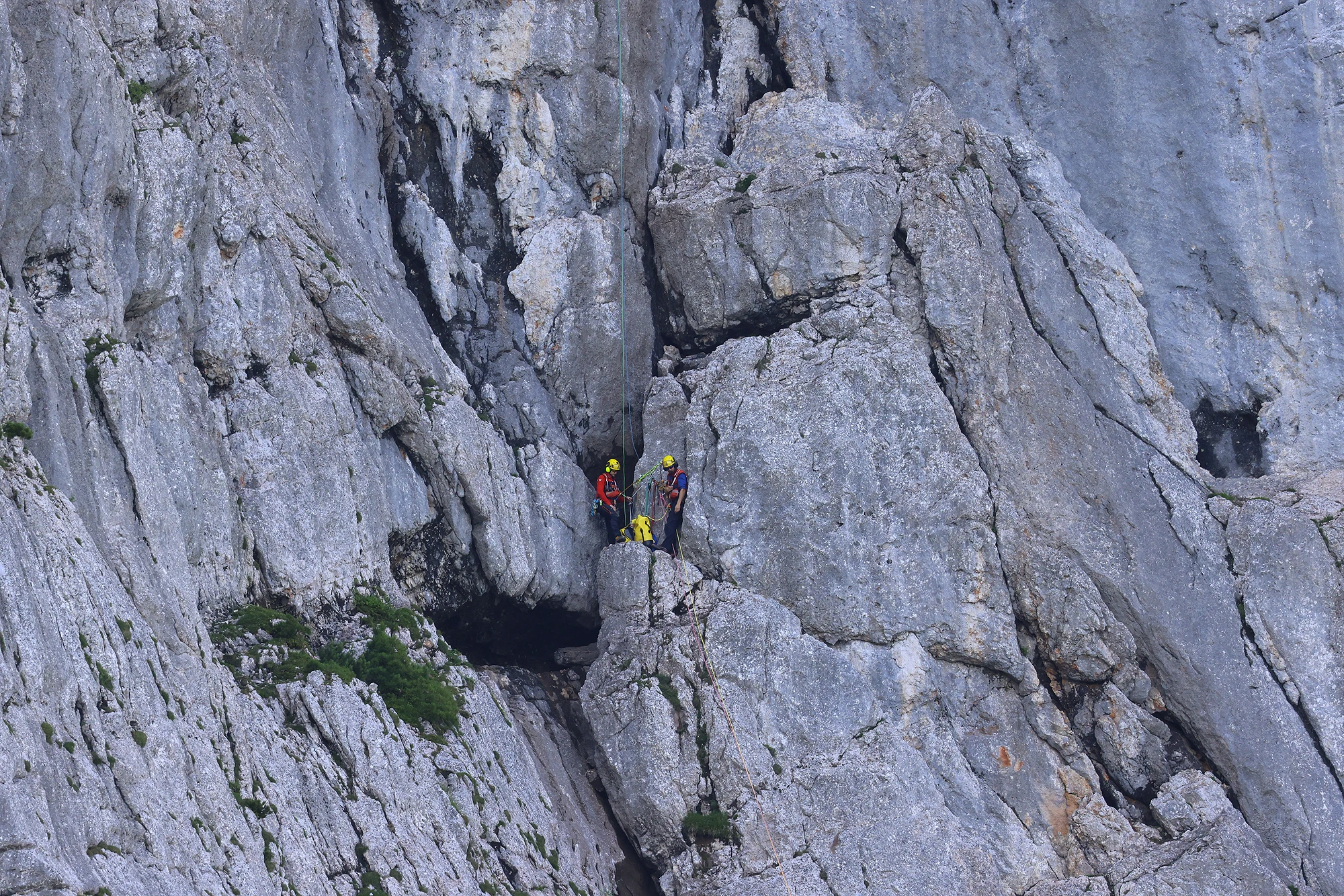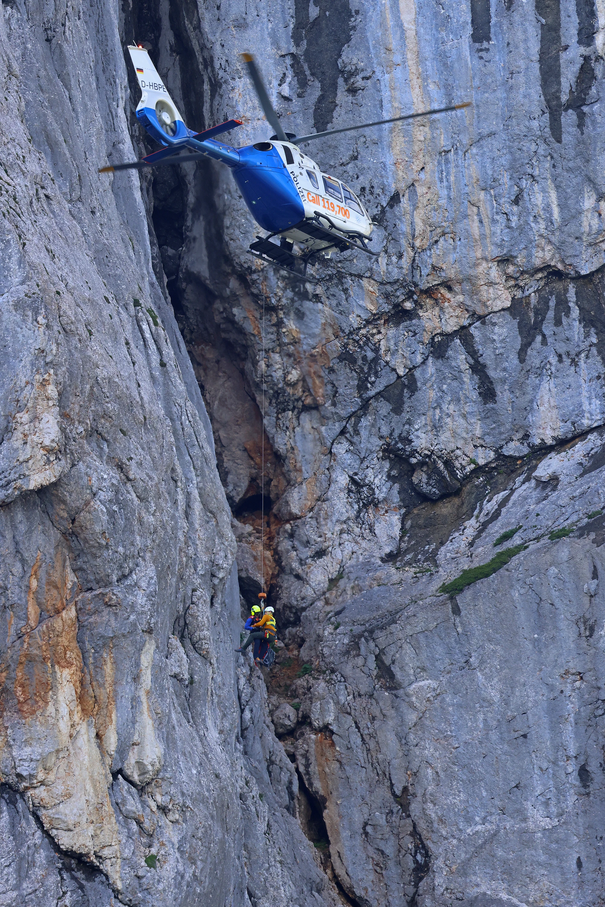 „Uns war besonders wichtig, dass beide Gäste so authentisch wie nur möglich miterleben, wie wir arbeiten und sich ein wirklich realitätsnahes Bild unserer Fähigkeiten machen können. Es ist für Entscheidungen welcher Art auch immer wichtig, im authentischen Gespräch vor Ort unsere Herausforderungen hautnah zu erleben. Deshalb sind wir für die Zeit, die sich Dr. Söder und Dr. Herrmann für uns genommen haben, sehr dankbar!“, erklärt Burger, der als Reichenhaller an der Reiteralpe mit das Klettern gelernt hat und den Beobachtern in der Seilbahn-Kabine Kletterrouten, alpines Klettern und die konkrete Rettungsübung in seinem „alpinen Wohnzimmer“ genau erklärte. Angenommen wurde, dass ein Kletterer im Vorstieg ins Seil stürzt und zunächst für den Heli unerreichbar so nah an der steilen Wand hängt, dass ihn die Bergwacht erst weiter auf einen Felsvorsprung abseilen muss, damit ihn der Polizeihubschrauber mit der Winde aufnehmen und ausfliegen kann. Die Reichenhaller Bergretter Michael Ellinger, Florian Neubauer, Thomas Fischer, Matthias Wich, Josef Aschauer und Florian Weber hatten das spektakuläre Szenario aufwendig vorbereitet, bereits am vergangenen Freitag durchgeprobt und dann zusammen mit der Besatzung der Polizeihubschrauberstaffel Bayern mit „Edelweiß 5“ eindrucksvoll für den Ministerpräsidenten in Szene gesetzt; das noch am Vortag angekündigte Unwetter blieb bis zum Abend aus und machte ihnen letztlich keinen Strich durch die Rechnung.