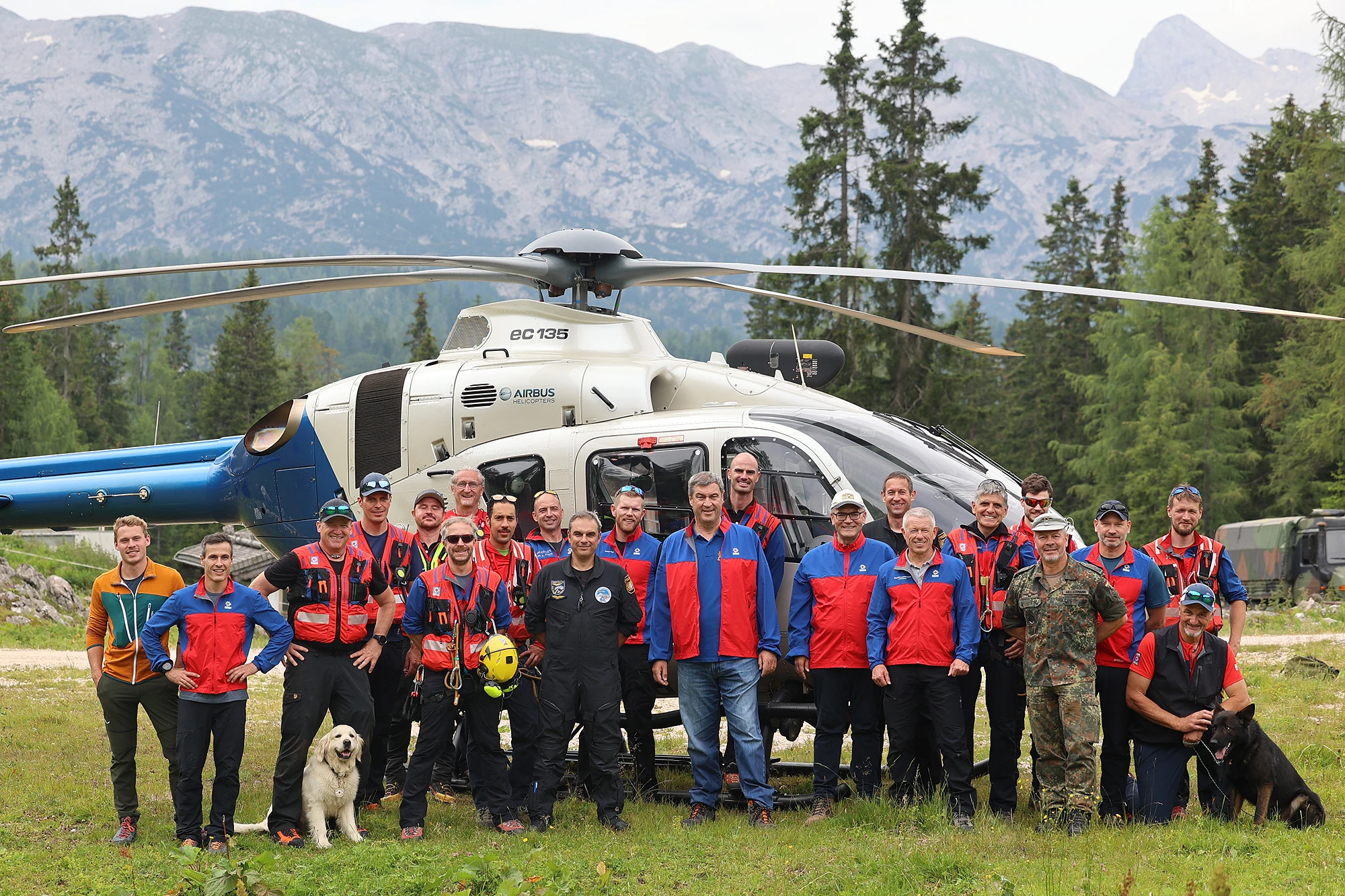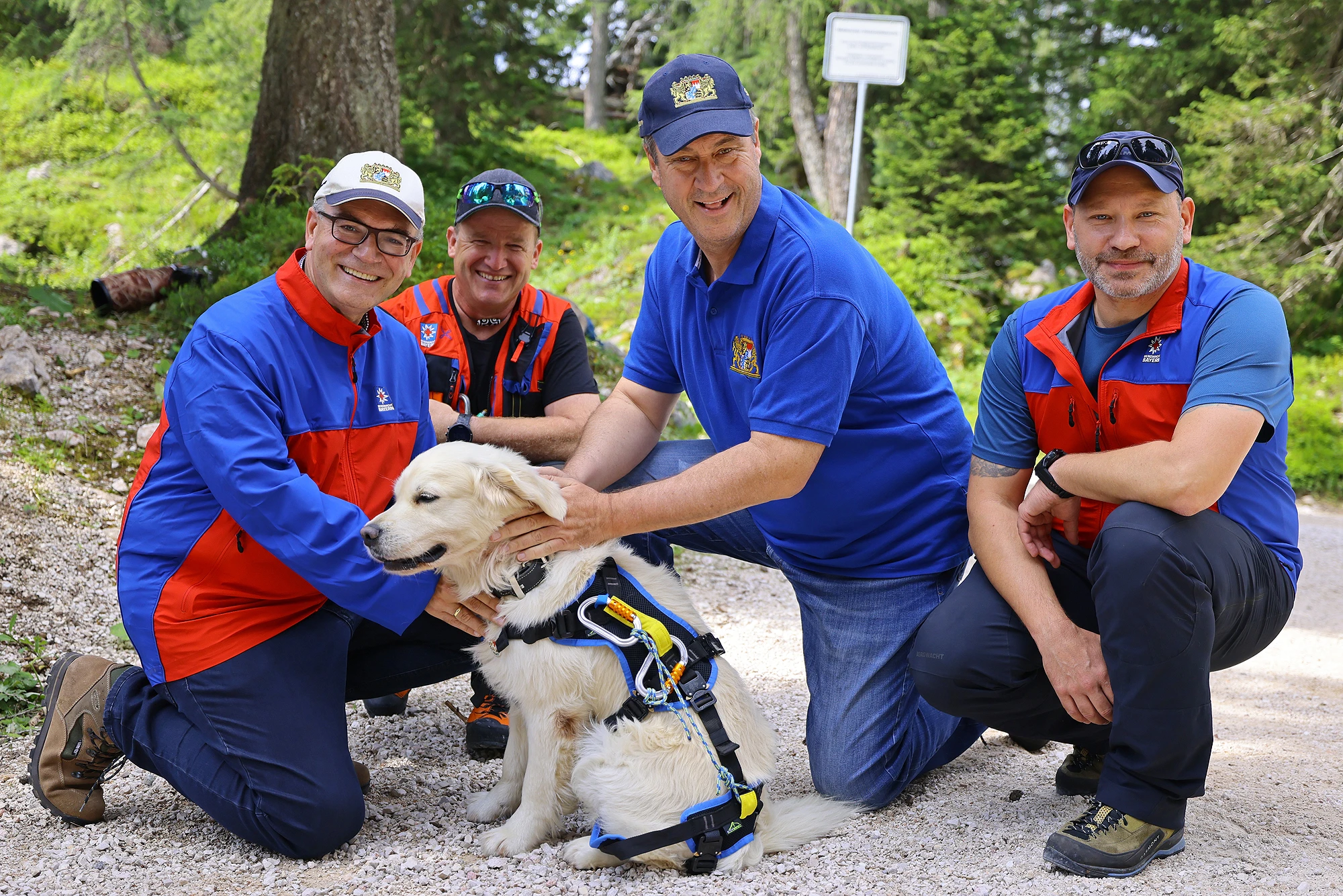 Auf dem Hochplateau führten anschließend Alex Beaury und Christian Schmitz vom Technikbus ihre Hochleistungswärmebilddrohne zur Vermisstensuche vor, wobei es sich der technikbegeisterte Ministerpräsident nicht nehmen ließ, auch mal die Fernbedienung selbst in die Hand zu nehmen. Besonders angetan war der Hundefreund Söder von der Lawinen- und Suchhundestaffel: Achim Perl, Stefan Strecker und Michael Partholl demonstrierten mit Sanchez und Xaverl, wie die Vierbeiner nur mit ihrer Nase einen im Gelände Vermissten aufspüren und dann ohne Bellen anzeigen, indem sie ihr Bringsel ins Maul nehmen und zum Hundeführer zurückkehren. Die Recco-SAR-Operatoren Andreas Zenz und Dr. Burger erklärten die Funktionsweise des deutschlandweit einmalig nur in Bad Reichenhall und Sonthofen stationierten und per Seil am Helikopter eingesetzten Recco-SAR-Detektors; eine weitere Möglichkeit, um im Gebirge und im unwegsamen Gelände Vermisste aufzuspüren, die entsprechenden Reflektoren bei sich haben. Bergwacht-Regionalgeschäftsführer David Pichler zeigte mit der Besatzung von „Edelweiß 5“, wie ein Verletzter im Luftrettungssack mit der Winde aufgenommen und ausgeflogen wird; danach konnte der Ministerpräsident zusammen mit Landesleiter Thomas Lobensteiner seilgesichert bei offener Türe auf der Heli-Kufe im Flug hautnah und respektvoll erfahren, dass die Retter im Flug- und Bergrettungsdienst starke Nerven brauchen, um sich allein schon von der luftigen und ausgesetzten Höhe nicht beeindrucken zu lassen.