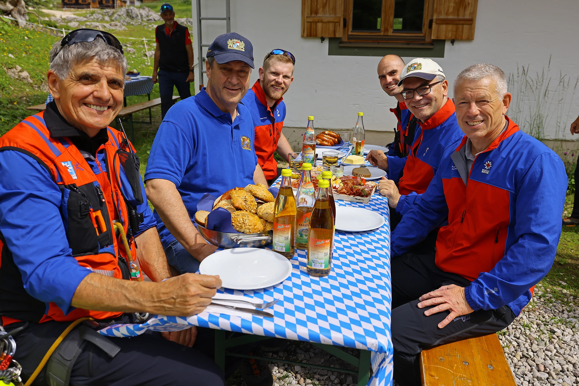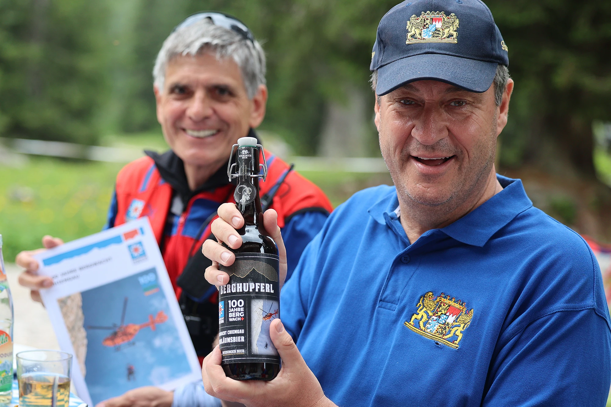 Bergwacht-Regionalarzt Dr. Enrico Staps begleitete die Gäste in der Seilbahn und am Hochplateau und stand während der Übung in der Felswand für medizinische Notfälle aller Arzt im Hintergrund bereit. Guido Fick, Marcel Häusler, Franz Maier und Sandra Abfalter hatten am Lenzenkaser eine vom Ministerpräsidenten spendierte bayerische Brotzeit vorbereitet, die sich Söder und Herrmann zusammen mit den Bergrettern schmecken ließen; als Zeichen der Wertschätzung überreichte Dr. Burger den „Wuiderer“ - ein speziell fürs 100-jährige Chiemgauer Bergwacht-Jubiläum gebrautes und abgefülltes Bier. Der neue Bergwacht-Landesgeschäftsführer Tobias Vogl dankte dem Direktor der Wehrtechnischen Dienststelle Oberjettenberg, Peter Pörsch und dem Standortsältesten der Gebirgsjägerbrigade 23, Oberstleutnant Oliver Gellermann für die Unterstützung und kameradschaftliche Zusammenarbeit. Unter anderem auf besonderen Wunsch des Reichenhaller Bergwacht-Bereitschaftsleiters Stefan Strecker überreichte der Ministerpräsident einen Geschenkkorb an Franz Schwab, der nach 37 Dienstjahren bei der WTD nun in den Ruhestand geht und jahrzehntelang oft auch zu den unmöglichsten Zeiten stets zur Stelle war, um die Seilbahn bei Bergwacht-Einsätzen in Betrieb zu nehmen.